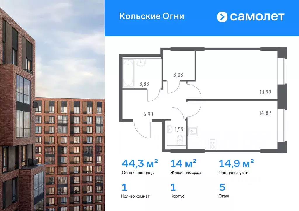 Строим кварталы для жизни с заботой о будущем. Предлагается 1-комнатная квартира комфорт-класса 44,34 кв.м в корпусе 1 на 5 этаже, в ЖК Кольские Огни Квартира без отделки. Доступность опции отделка и возможность комплектации мебелью и декором уточняйте у застройщика.Приобрести квартиру возможно по специальным акциям от застройщика, с текущими условиями акций можно ознакомиться в блоке Акций .Цена динамическая и может отличаться, уточняйте актуальность у застройщика.Жилой комплекс Кольские Огни будет построен в Мурманской области, в городе Кола. Путь до центра Мурманска будет быстрым — всего 25 минут на машине.Рядом — Поморская набережная, парк, тундровый сад и лес всего в 10 минутах пешком.На первых этажах домов откроются кофейни и магазины, фитнес-зал и салон красоты, аптека, пункты выдачи заказов. Рядом с жилым комплексом работают детский сад, спортивная школа с бассейном и ФОК.Во дворе — озеленение, спортивные площадки, ремонт велосипедов, догхабы. Еще на территории квартала построим паркинг с зарядкой для электромобилей. Корпуса высотой 912 этажей и 1417-этажные башни украшают деревянные панели. На входе в подъезды не будет ступеней и высоких порогов. После прогулки велосипеды и коляски можно оставить в местах хранения.Продуманные планировки от небольших студий до просторных 4-комнатных квартир. Отделка на выбор: готовая, White Box или вариант без нее. Выбирайте варианты без отделки, если хотите реализовать собственные решения.